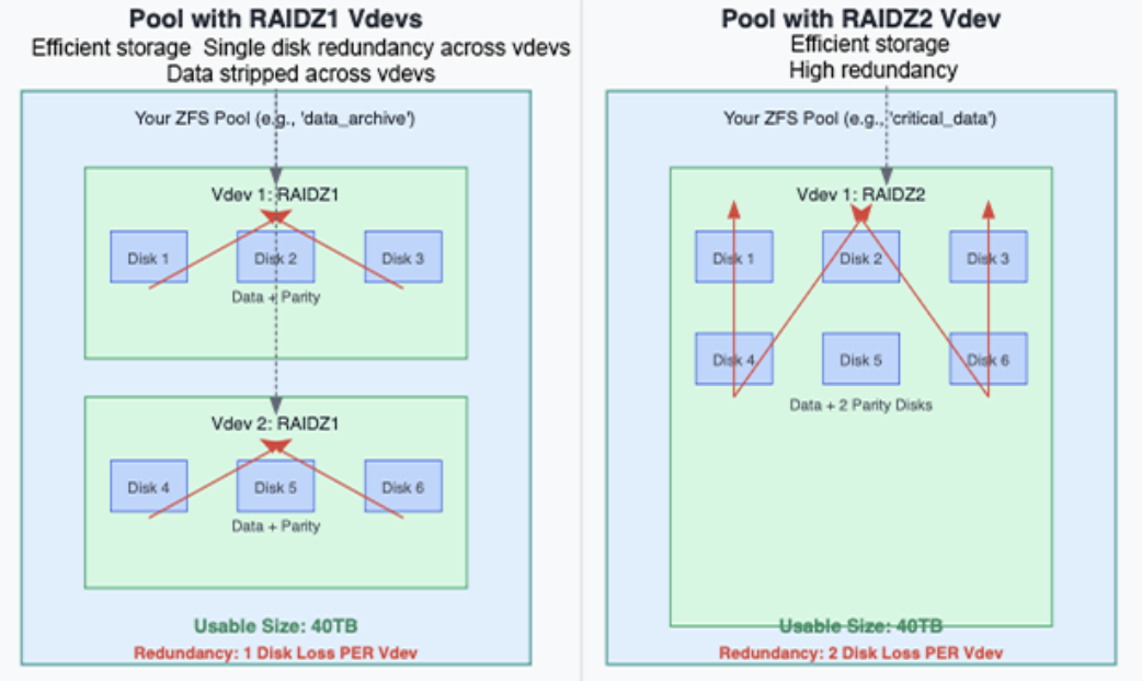 Redundanz gilt immer pro vdev. Wenn ein vdev ausfällt, fällt der gesamte Pool aus, auch wenn andere vdevs gesund sind. Planen Sie Ihre vdevs sorgfältig!